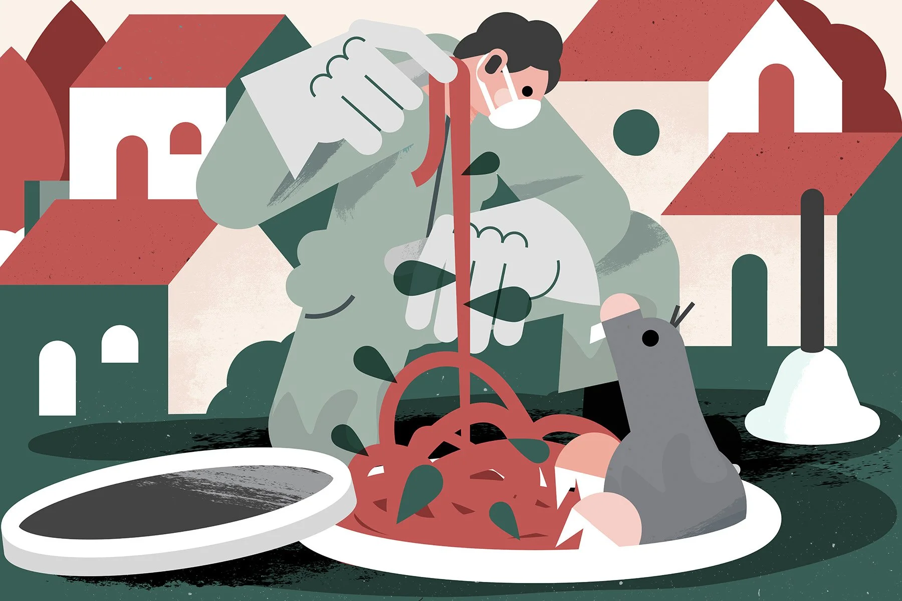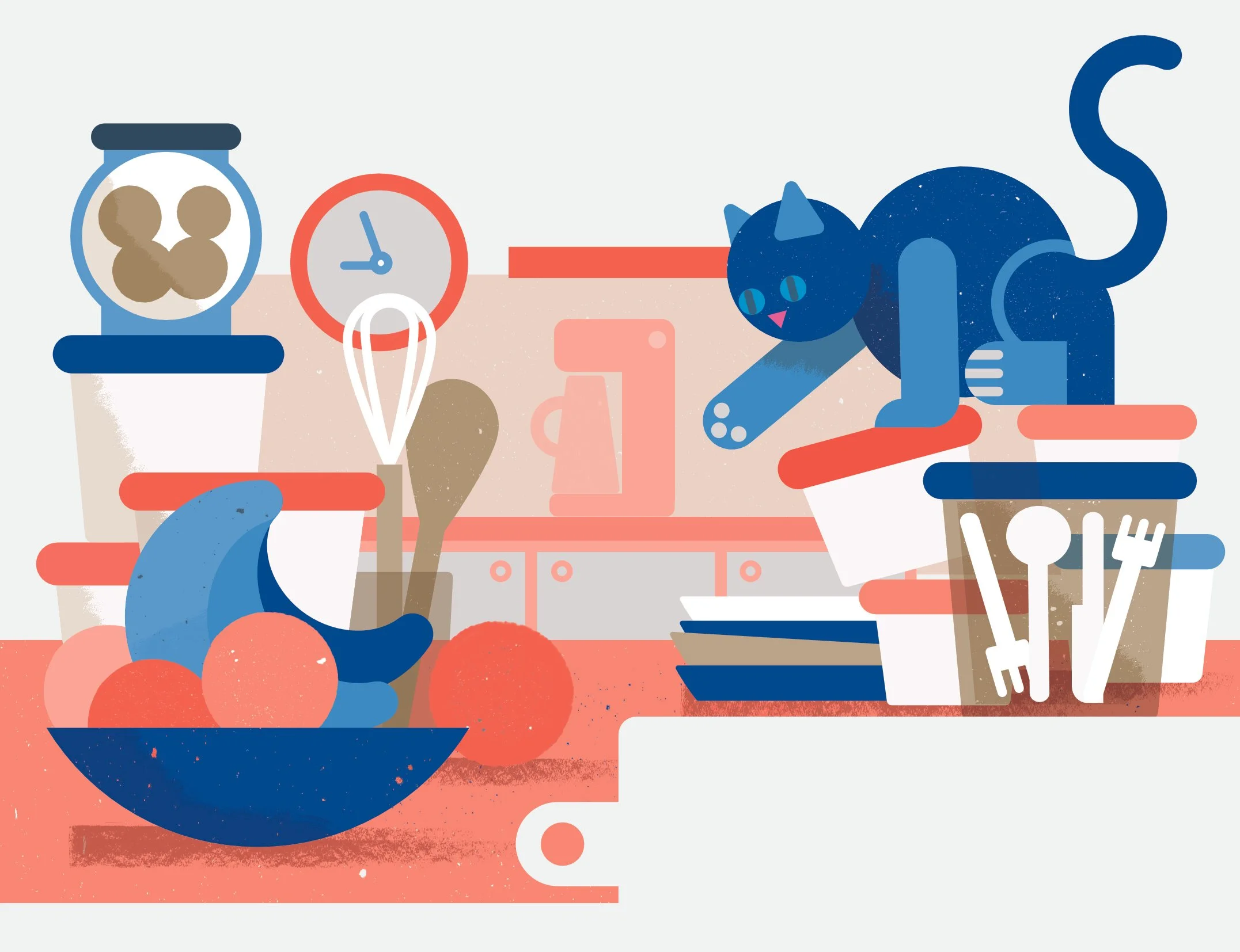 One piece explores how to manage kitchen countertop clutter, while another highlights the hidden costs of buying cheap, trendy furniture. A third illustration deals with the less glamorous but very real problem of clogged sewers, and the final one looks ahead to Los Angeles’ ambitious transportation plans in the lead-up to the 2028 Olympic Games.