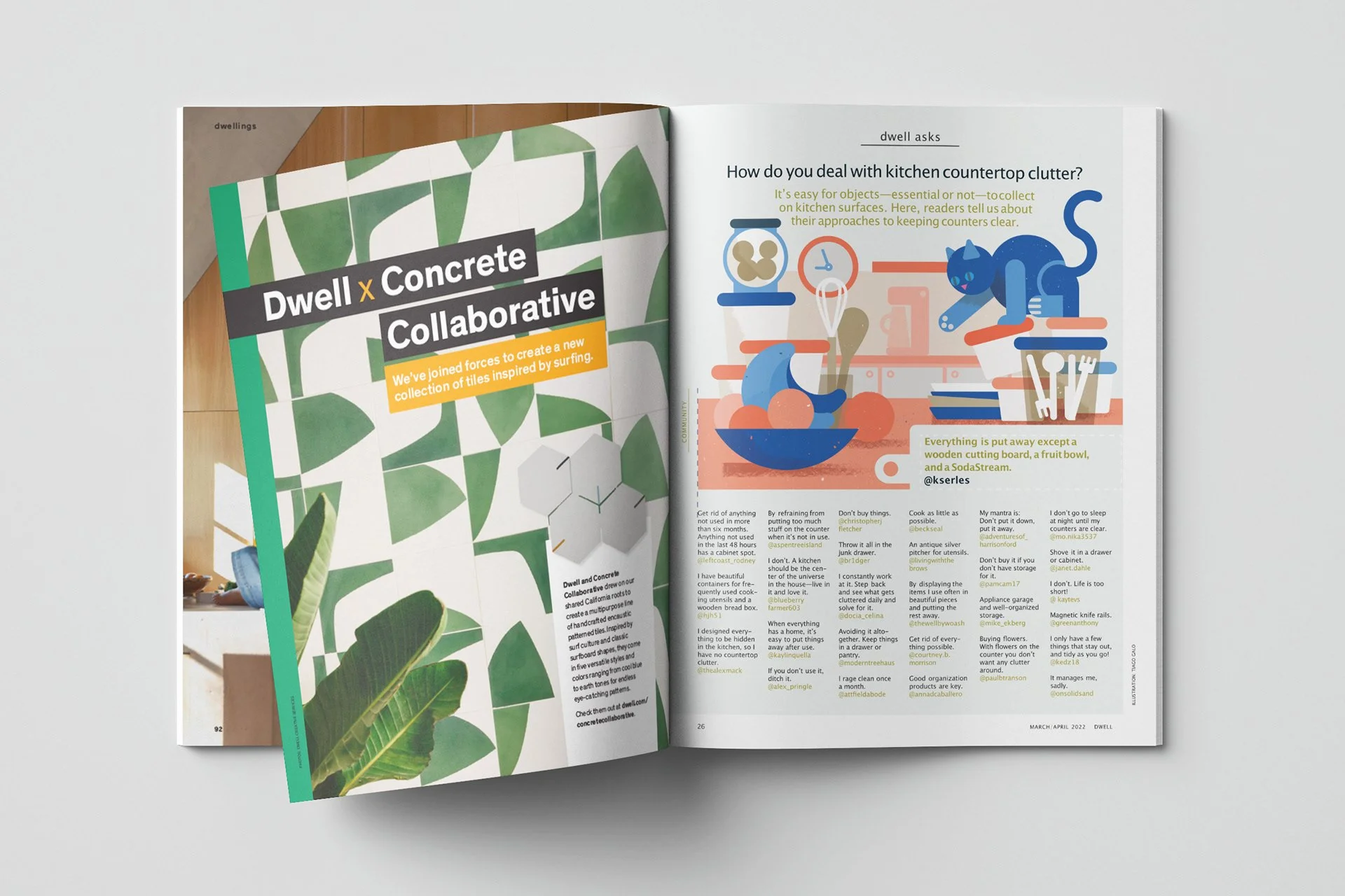 A set of illustrations for Dwell Magazine, covering a range of topics from daily domestic issues to city-wide transformations.